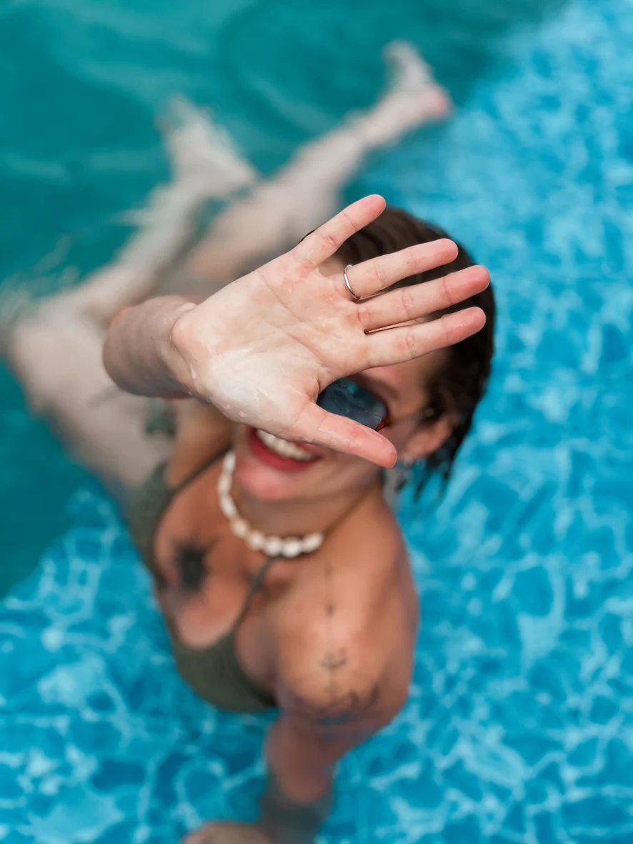 Remember how I said I’m kinda shy? Yeah, I’m literally hiding behind my hand here, lol. But don't let that fool you... when I’m relaxing by the pool like this, my mind wanders to some very interesting places. 💦